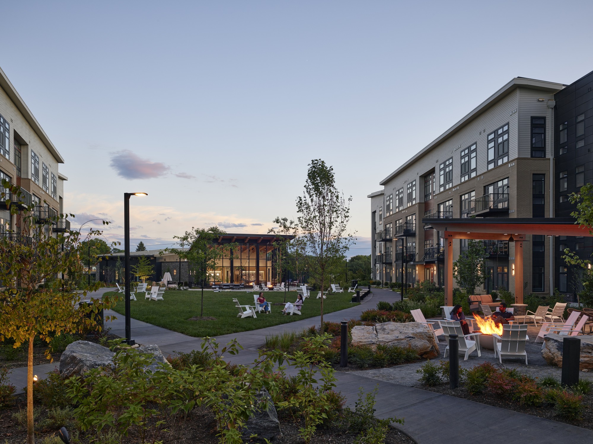 Located in Hagerstown, Maryland, on Meritus School of Osteopathic Medicine’s campus, this site was set in a peaceful, wooded area. The design team sought to celebrate this site and encourage residents to spend time outside, so they arranged the project’s five apartment-style residential buildings in a way that created a generous courtyard and then nestled the central “jewel-box” amenity building into this greenspace. An emphasis on nature and indoor-outdoor connection was an important concept for this project, not just due to the site context, but also because access to nature is a wellness amenity. Much research has been done around the connection between greenspace and stress relief. One such study found that short visits to nature areas have a positive impact on stress relief proven by the reduced levels of cortisol (the stress hormone) in study participants2. Design Collective recognized that this green, stress-relieving amenity would be important for the busy medical students living here.