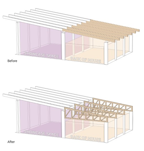 Another major coordination effort was required at the low roof edge of the building. The conceptual design called for mass timber beams running the entire length of the roof structure from the interior to the exterior, expressing through the façade at the front and back eaves. This detail was designed for both concept and performance: it reinforced the indoor–outdoor connection, supported the roof overhang, and, particularly on the south side, served as a solar shading device for the tall glazed volume during summer conditions. With the hybrid system, the low roof side transitioned to a conventional truss system in areas with dropped ceilings, making it important to maintain the extension with adequate support detailing. Cagley Associates designed a small, tapered truss to support the overhang, and Design Collective coordinated a “boxed-beam” detail as a creative solution that achieved required cost reduction while maintaining the original design intent at the eaves.