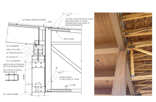 The gridline where the mass timber system met the conventional wood truss system required a specific detail to resist lateral loads. Cagley Associates, the project’s structural engineer, proposed a moment connection at this interface to avoid steel cross-bracing (the alternate approach) that would have impeded the program spaces. The solution worked structurally and architecturally, but it surfaced a predictable challenge: contractual responsibility for the interface detail.
